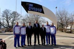 President of the Olympic Committee of Serbia Vlade Divac, Minister of Youth and Sport of the Republic of Serbia Vanja Udovičić and his Excellency the Ambassador of Azerbaijan to Serbia Eldar Hasanov and our basketball players took the opportunity to have to have their picture taken on Terazije in front of the Olympic clock that counts down the days till the beginning of European games. Together they cut the first sliceof birthday Olympics cake.