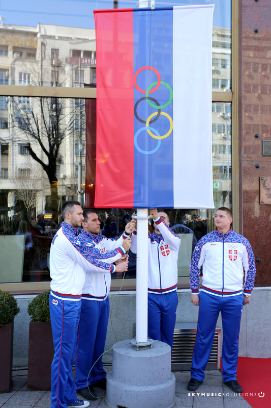 With the national anthem of the Republic of Serbia, the Serbian Olympic Committee flag raised are world champions in basketball 3 on 3 and ambassadors of the first European Games in Baku: Dušan Domović-Bulat, Marko Savić, Marko Ždrelo and Dejan Majstorović.