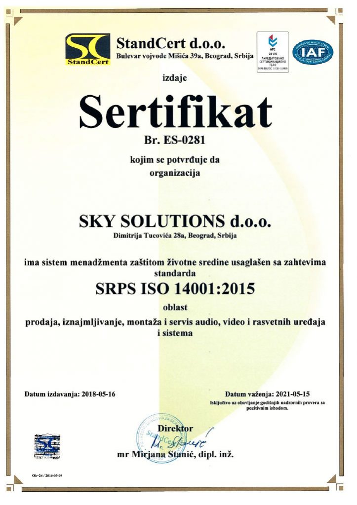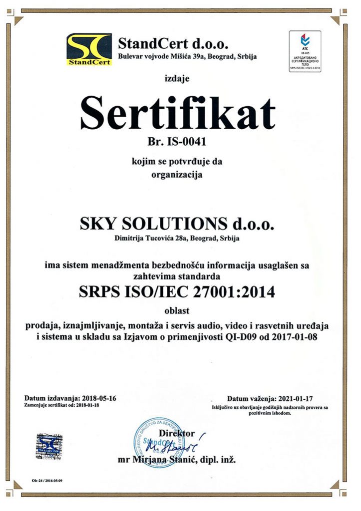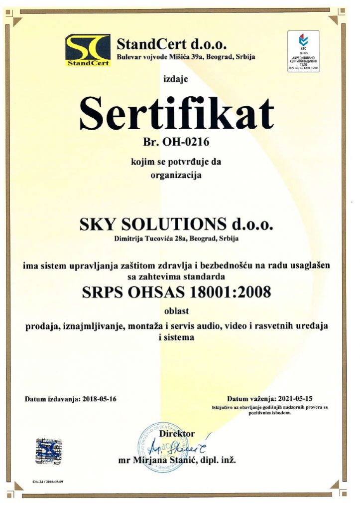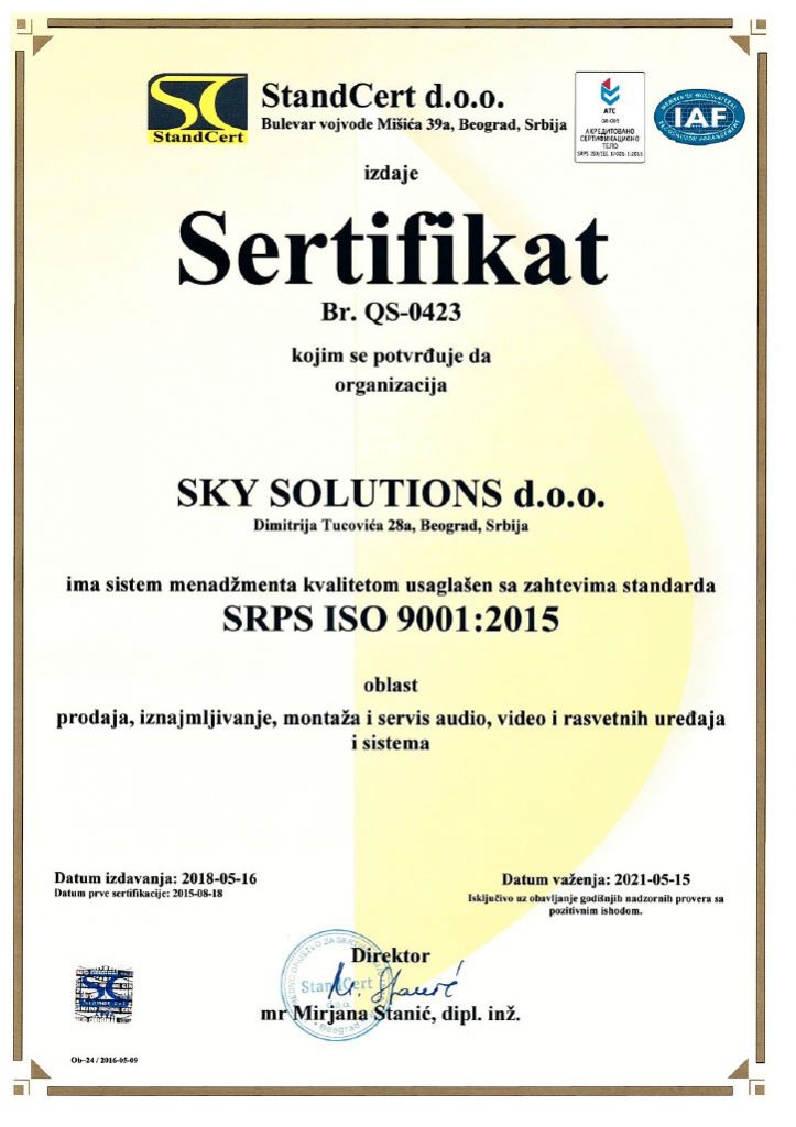 Organizacija „SKY MUSIC SOLUTIONS“ d.o.o, Beograd uspostavlja, primenjuje i održava Politiku kvaliteta u skladu sa zahtevom međunarodnog standarda ISO 9001:2008.